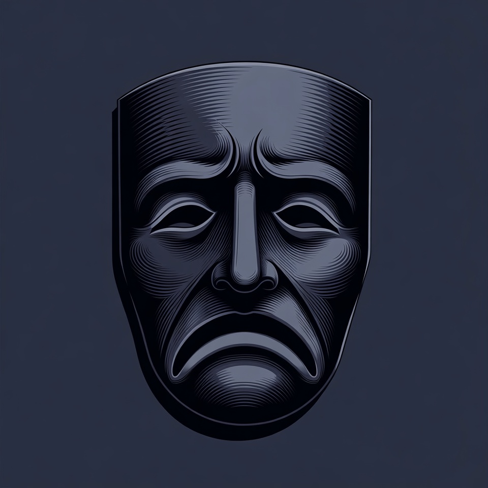 A detailed black line art illustration of a classical tragedy theater mask with a frowning expression. The mask features downturned eyes and mouth on a dark navy background. It is rendered in a vector style with bold contours and shading.
