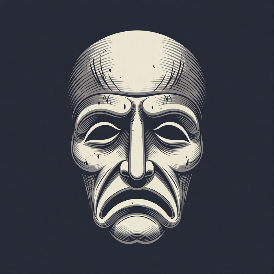 A detailed line art illustration of an ancient Greek tragedy mask with a frowning expression. The mask features deep-set eyes, furrowed brows, and a wide-open mouth in a grimace. It is rendered in white and gray tones against a dark navy background.