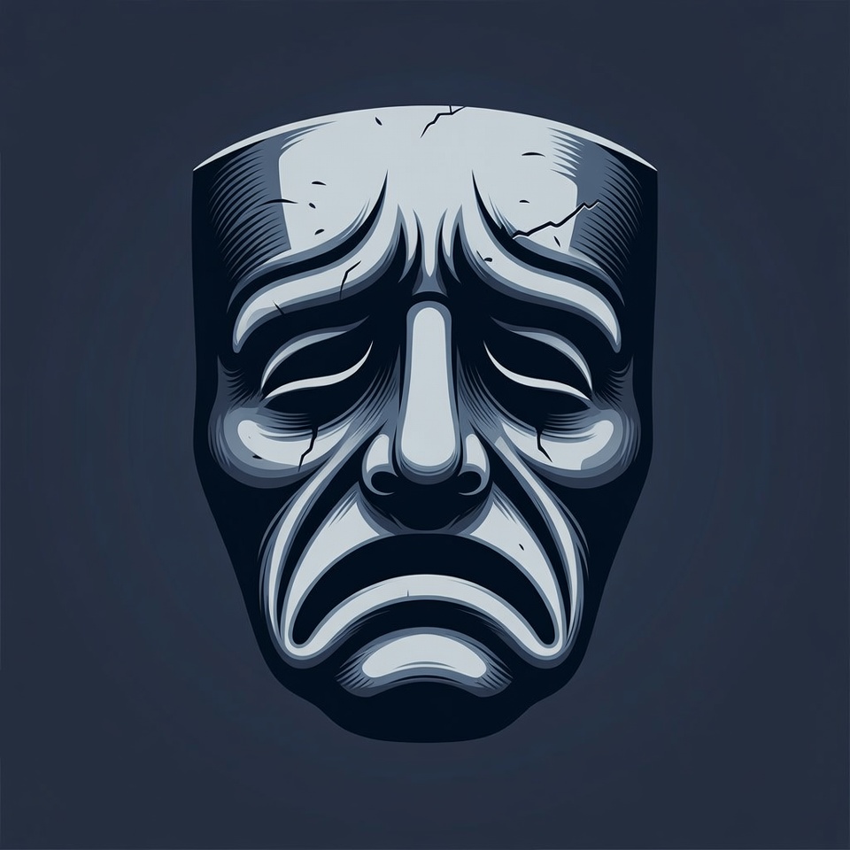 A detailed vector illustration of a white stone tragedy mask with a frowning expression. The mask features deep wrinkles, closed eyes with tears, and cracks on its surface. It is centered on a dark navy background.