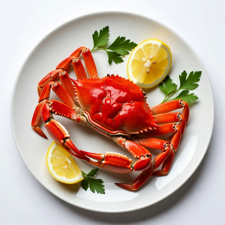 cooked crab, crustacean, culinary, dinner plate, food photography, food plating, fresh crab, garnish, gourmet food, green parsley, isolated background, lemon, lemon wedges, parsley, red crab, seafood, top view, white plate, whole crab, crab