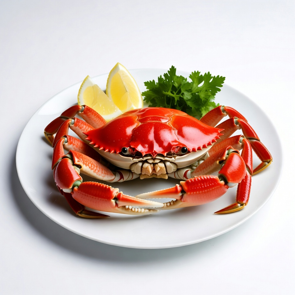 claws, crustacean, dinner plate, food photography, fresh herbs, gourmet seafood, isolated background, lemon slices, parsley garnish, plate, red crab, seafood, shell, white plate, crab