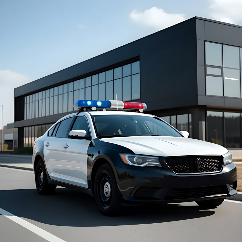A white police sedan with black accents and flashing red and blue lights on top is parked on a road. It faces a modern black building with large glass windows under a partly cloudy sky. The vehicle features a Ford Taurus design with police rims and utility equipment.