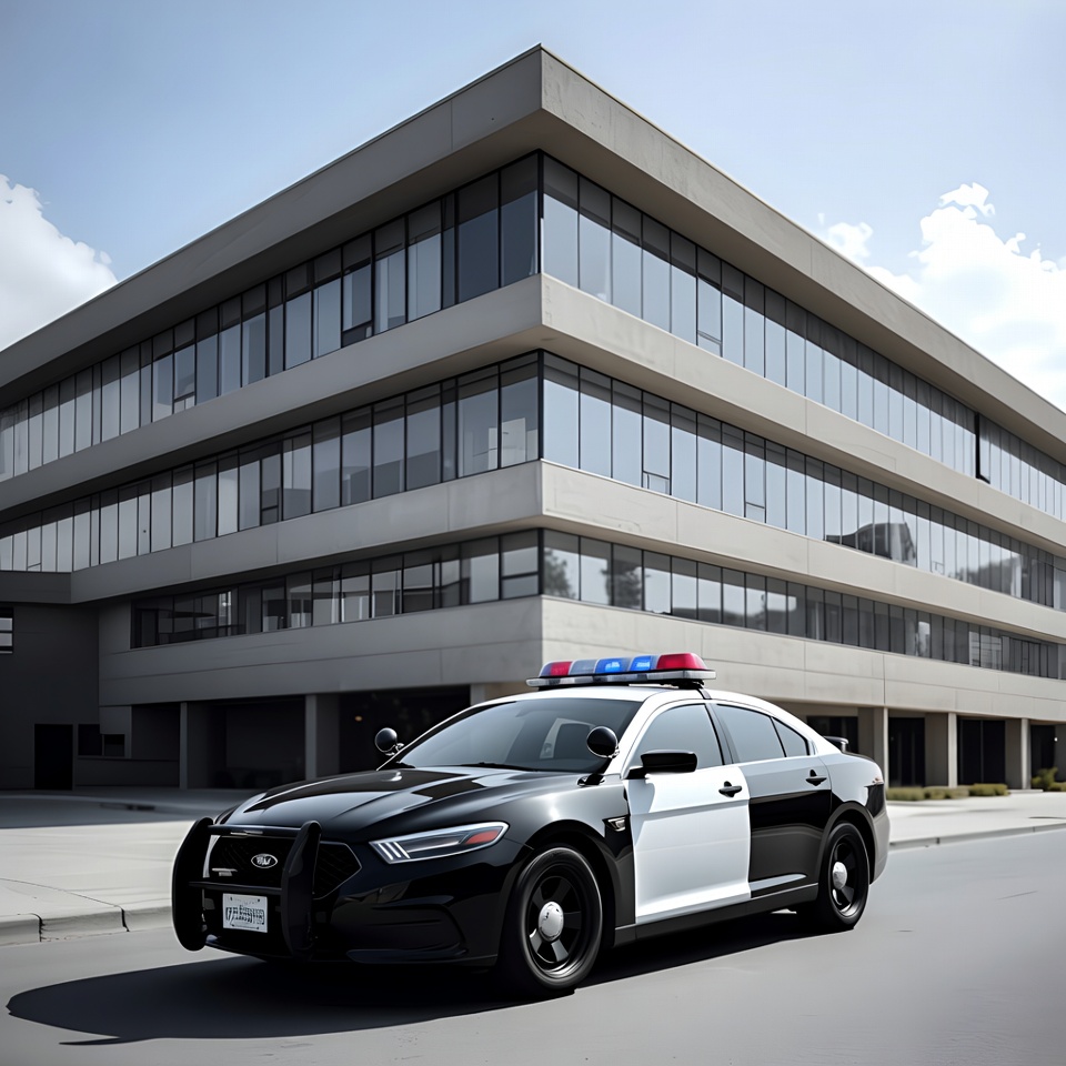 Ford Taurus, angular building, black and white, blue lights, cloudy sky, concrete architecture, emergency lights, glass windows, law enforcement, modern building, multi-story, patrol car, police vehicle, push bumper, red lights, street parking, urban scene, police car