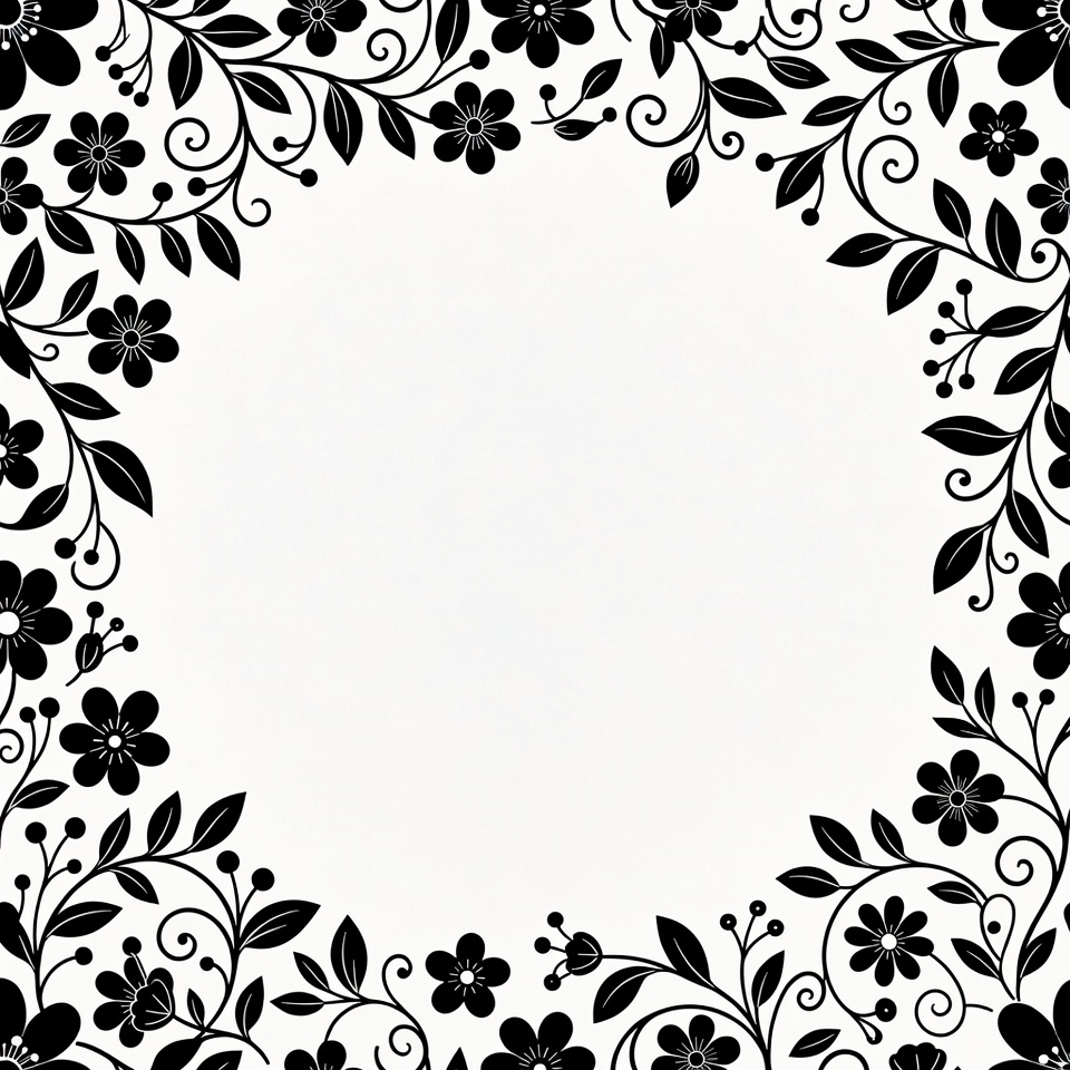 black flowers, black silhouette, black white, border art, clipart, craft template, daisy flowers, decorative element, decorative frame, digital border, elegant frame, empty center, floral clipart, floral ornament, floral wreath, flower border, graphic element, illustration, isolated background, leaf pattern, ornamental border, plant motif, silhouette flowers, symmetrical design, vine border, vine design, white background, floral frame