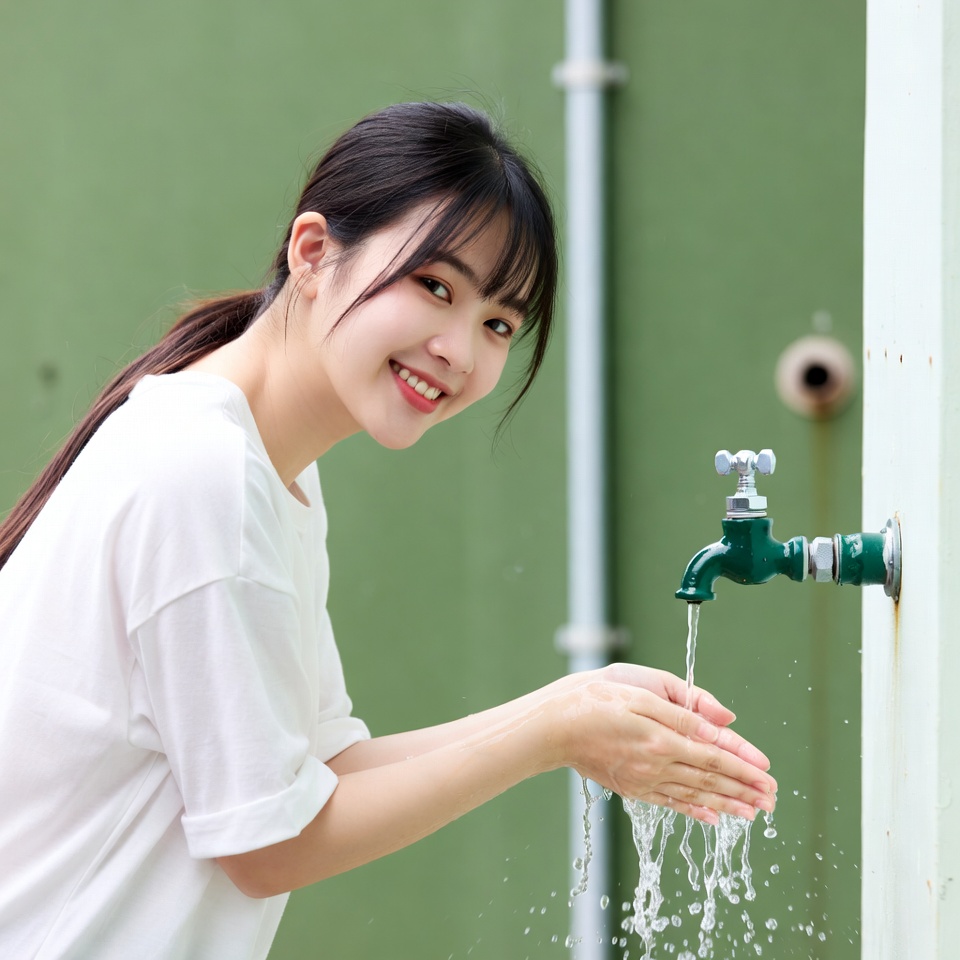A young Asian woman with long black hair tied in a ponytail smiles while washing her hands under a green outdoor faucet. She wears a white short-sleeved shirt and stands against a green wall with white sections and pipes. Water flows from the faucet onto her hands.