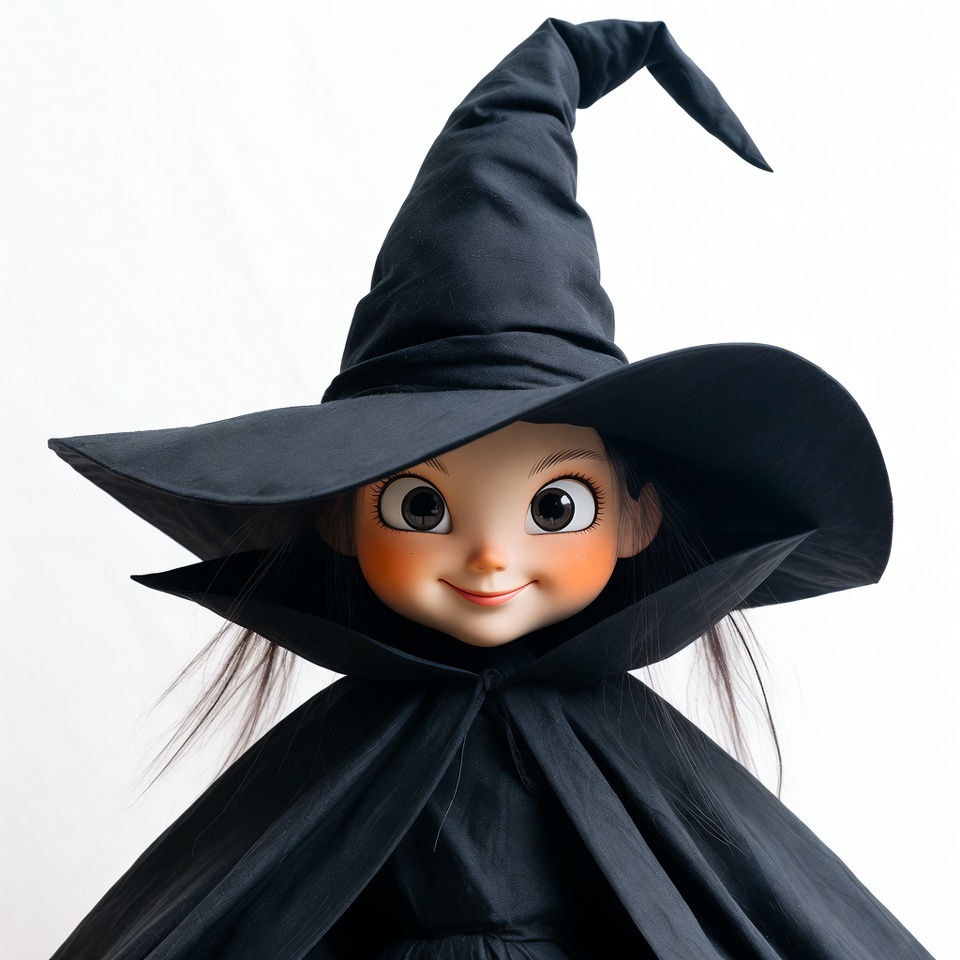Asian, Halloween witch, anime style, black cape, black witch hat, cute doll, dark hair, doll face, female, girl doll, illustration, isolated background, large eyes, magical girl, pointed hat, rosy cheeks, toy doll, witch doll