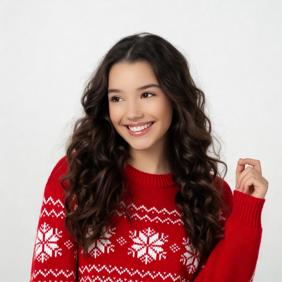 A young girl with long curly brown hair smiles while wearing a red knitted sweater adorned with white snowflake patterns. She stands against a white background, glancing sideways with her hand raised near her face. Her expression is cheerful and engaging.