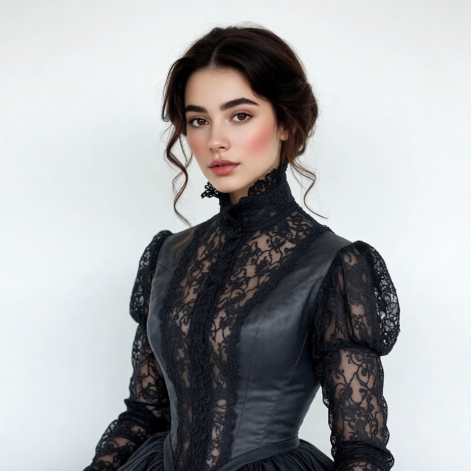 Victorian dress, White, black lace gown, blush makeup, brunette hair, dark hair, elegant portrait, female, formal attire, full skirt, gothic style, high collar, lace details, lace fabric, long sleeves, pink lips, portrait photography, puffed sleeves, studio photo, updo hairstyle, vintage fashion, white background, young woman, woman