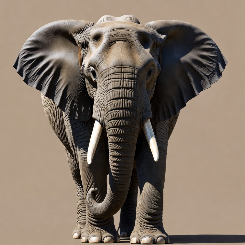 A majestic elephant stands frontally with large flapping ears, prominent tusks, and expressive eyes. Its textured gray skin and trunk are detailed against a plain beige background. The elephant appears isolated and centered in the frame.