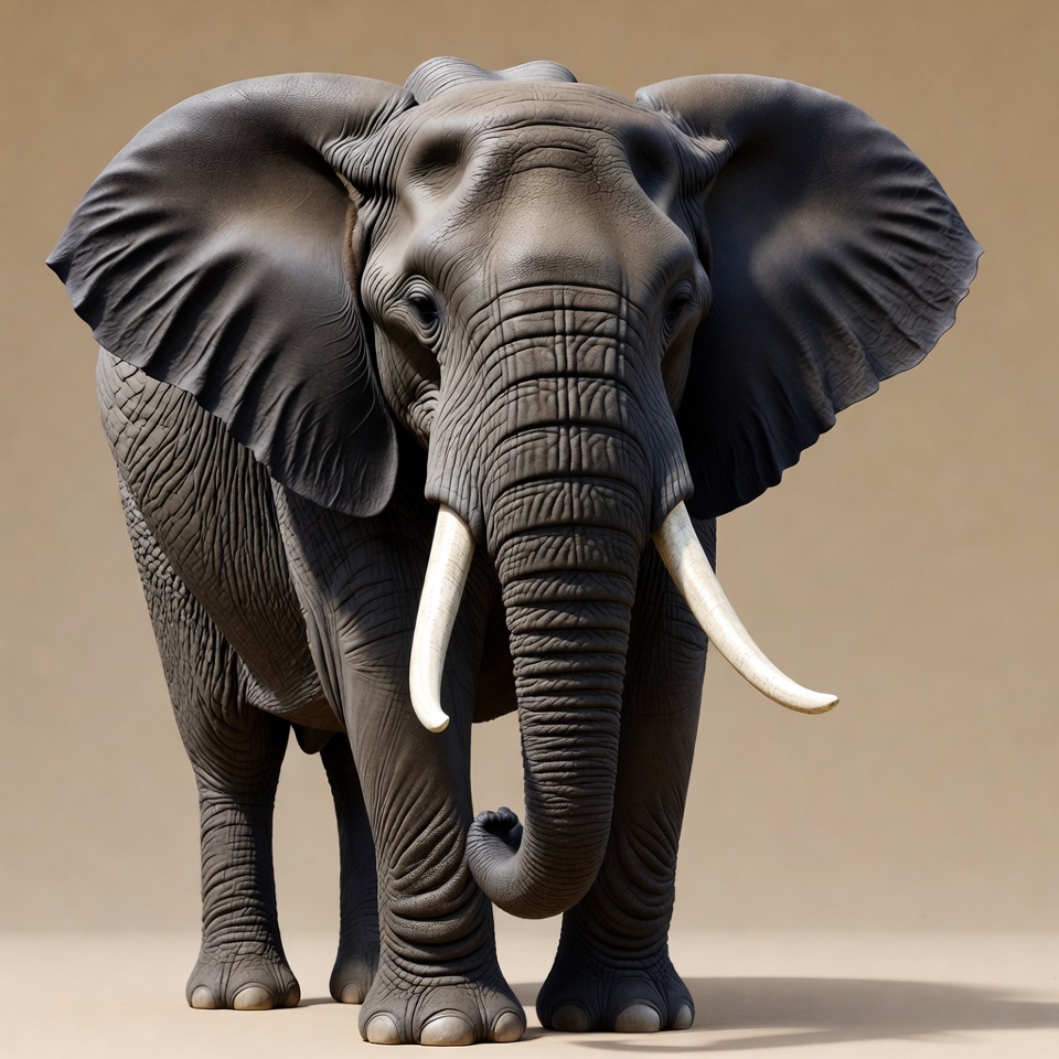 A realistic 3D rendered elephant stands on a plain beige background. It has large flapping ears, long curved tusks, and a muscular trunk curled slightly. The elephant faces forward with detailed gray skin texture.