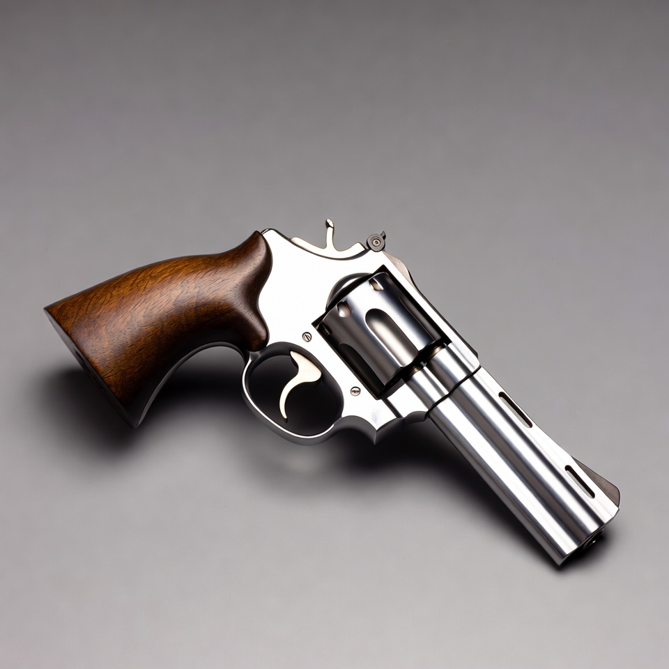 A polished silver revolver with a wooden grip lies on a gray background. The six-shot cylinder and trigger are clearly visible. The barrel is sleek and metallic with detailed engravings.