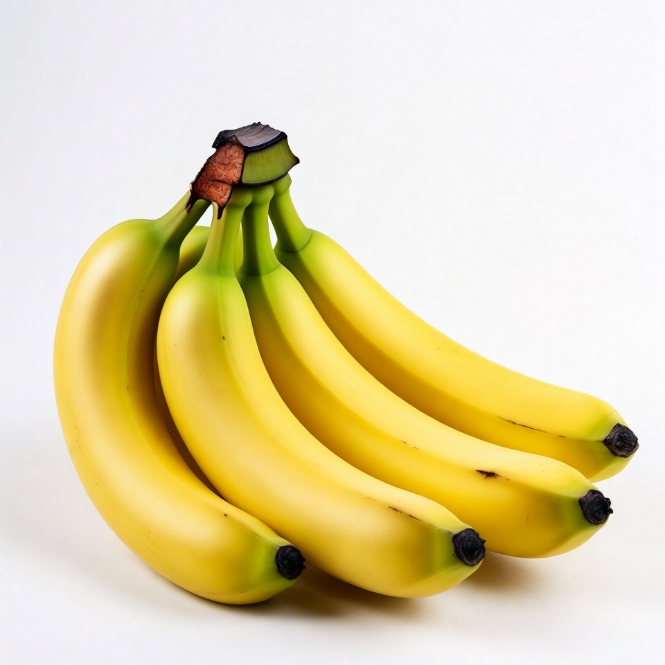 A cluster of five ripe yellow bananas is arranged together on a plain white background. The bananas feature vibrant yellow peels with green stems and a small brown tip at the top. They are positioned slightly angled, showcasing their curved shapes.