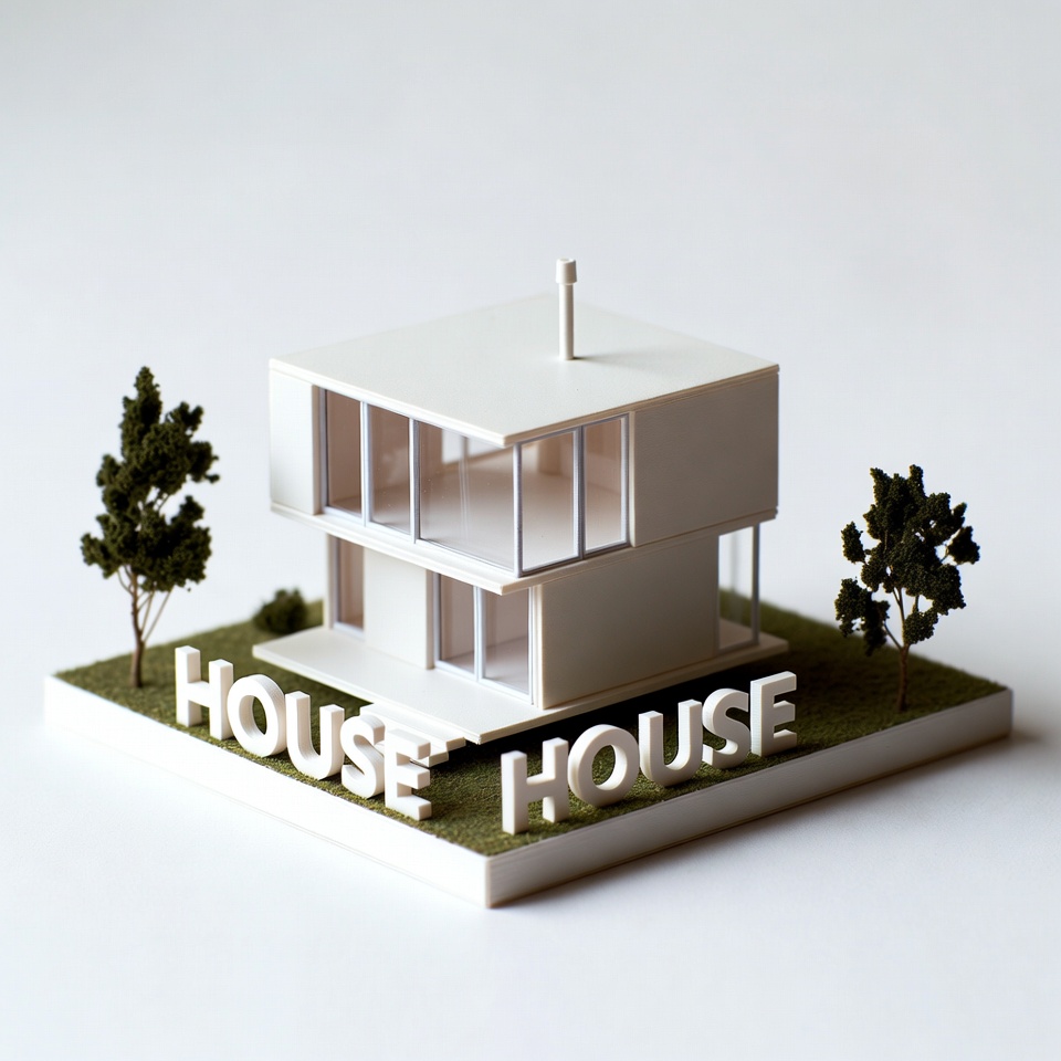 A small-scale white modern house model features a flat roof, large glass windows, and a chimney. It sits on a green grass base surrounded by tiny trees. The word 'HOUSE' is spelled out in white block letters twice in front of the structure.