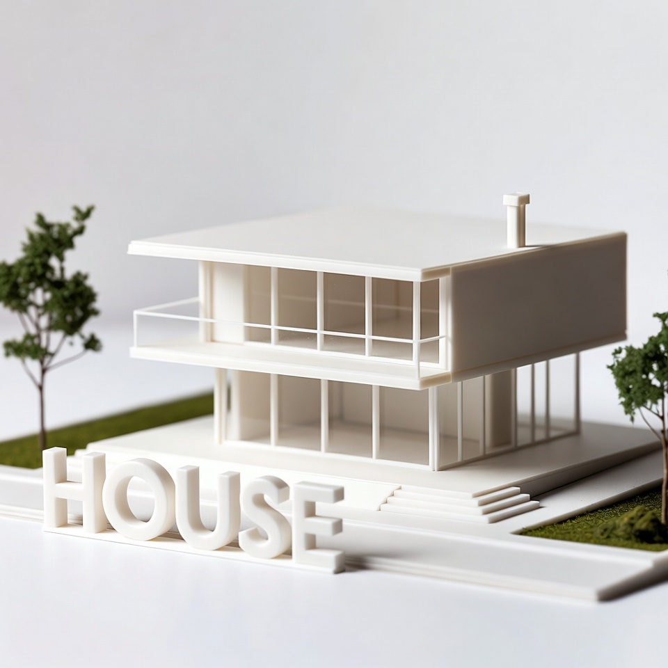A small white 3D printed model of a modern house features large glass windows, a balcony, chimney, and steps. It sits on a green grass base with tiny trees on either side. The word 'HOUSE' is displayed in large white block letters in front of the model.