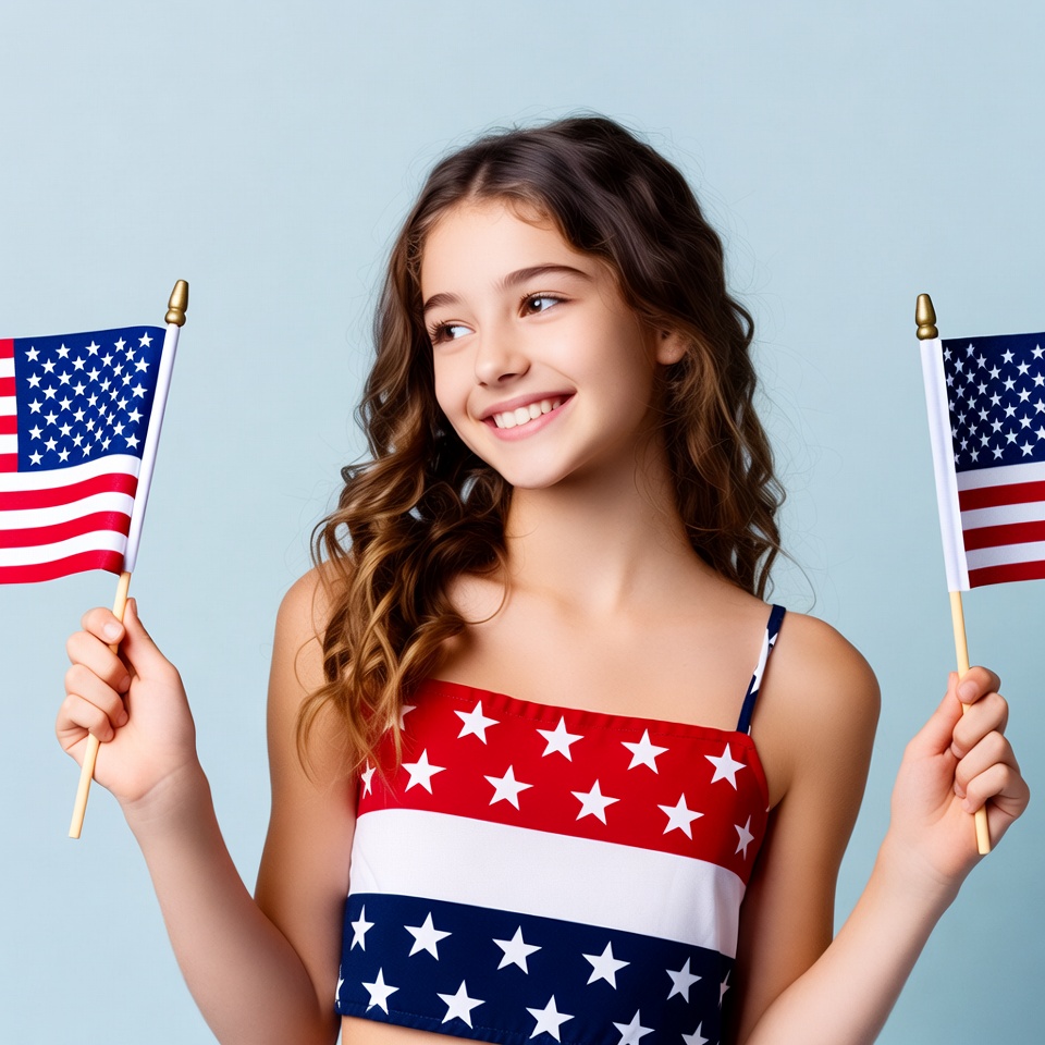 A young girl with long wavy brown hair smiles happily while holding two small American flags in her hands. She wears a red, white, and blue striped crop top with white stars on a blue background. The image features a solid light blue background.