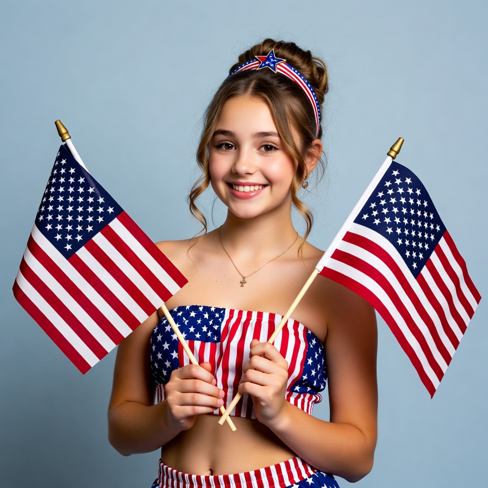 American flags, Fourth of July, Independence Day, USA flags, White, blue background, brown hair, cross pendant, curly hair, female, hairband, holding flags, necklace, patriotic outfit, smiling, tube top, young girl, girl