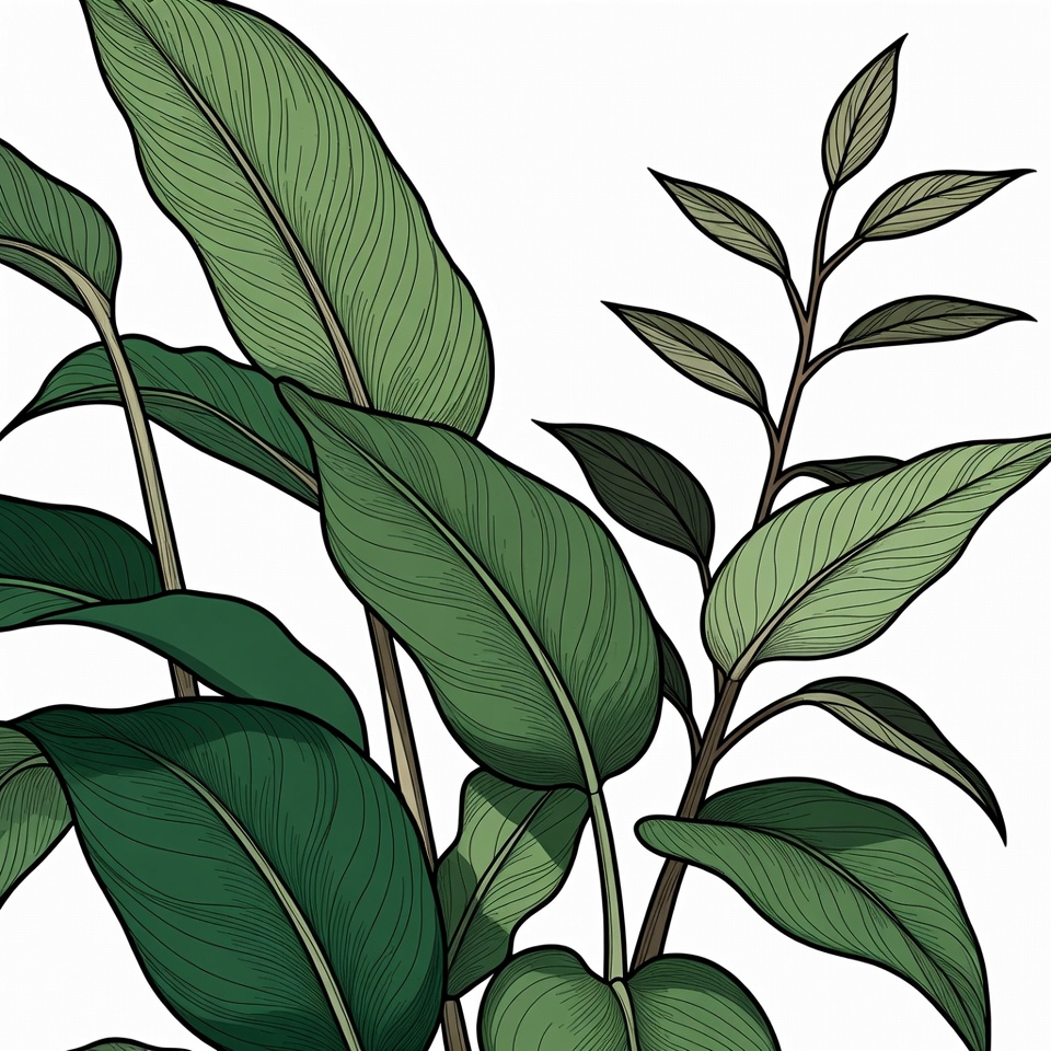 botanical illustration, clipart, exotic plant, foliage, green foliage, green leaves, illustration, isolated background, leaf drawing, nature art, palm leaf, plant leaves, tropical plant, vector art, banana leaf
