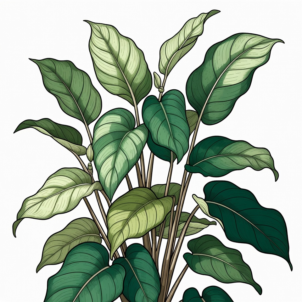 botanical illustration, broad leaves, clipart, decorative plant, foliage, glossy leaves, green foliage, green leaves, illustration, indoor plant, isolated plant, large leaves, leaf cluster, plant art, plant leaves, potted plant, tropical plant, variegated plant, vector plant, white background, white leaves, houseplant