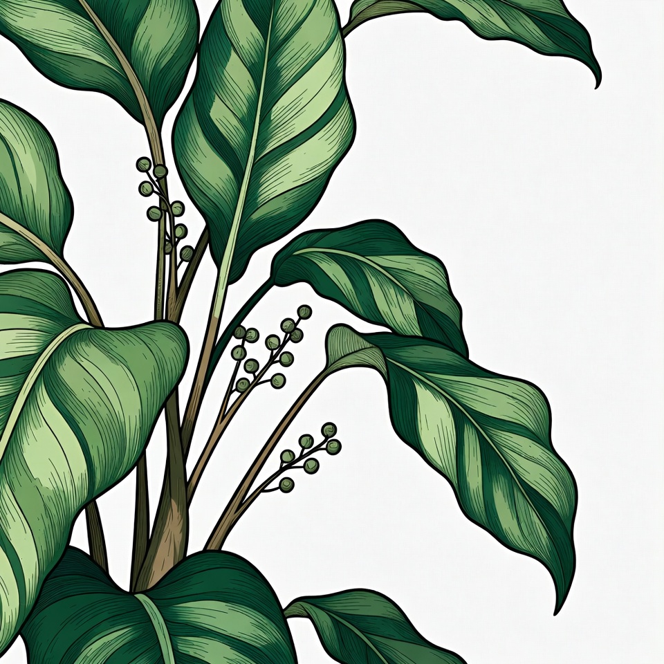 A detailed illustration of a green Calathea plant with large, veined leaves and small berries on thin stems. The leaves feature bold green hues with white stripes and are arranged dynamically against a white background. The artwork emphasizes intricate line work and natural plant textures.