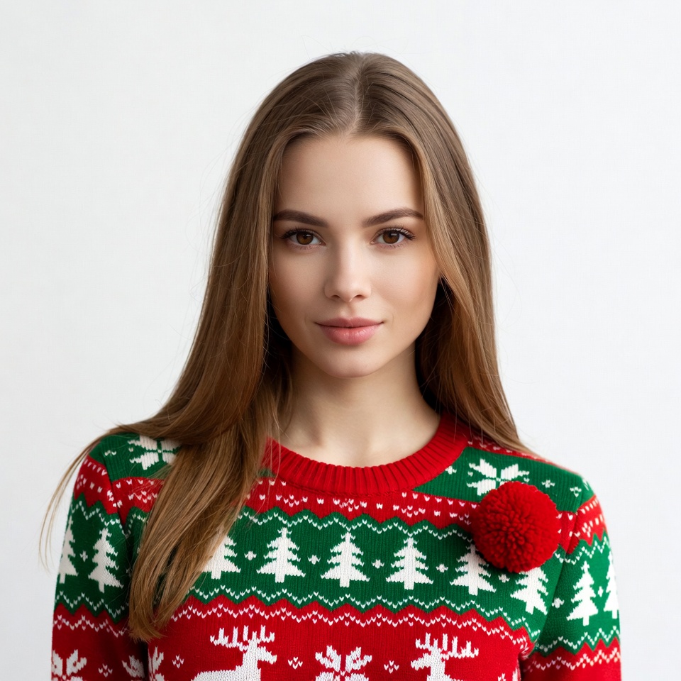 Christmas sweater, Christmas trees, White, brown hair, festive clothing, green sweater, holiday portrait, holiday sweater, knitted sweater, long hair, portrait, red green sweater, red pom-pom, reindeer sweater, smiling woman, ugly Christmas sweater, white reindeer, winter fashion, young woman, woman