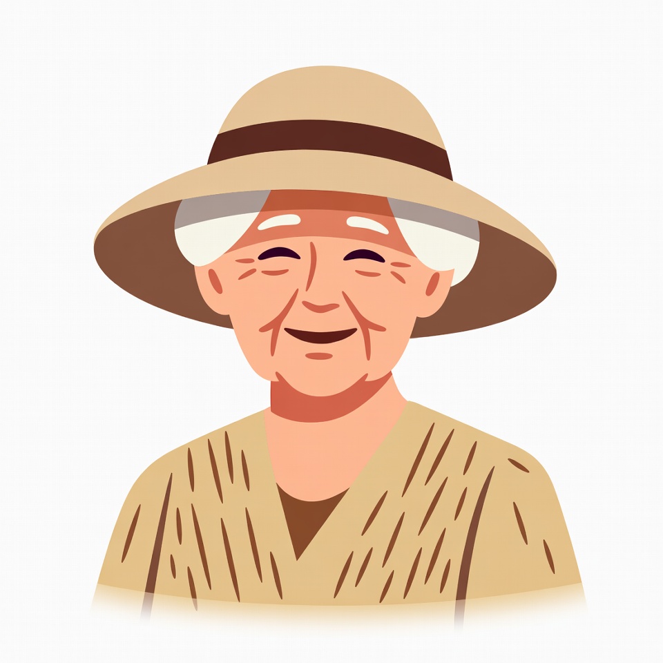 A cheerful elderly Asian woman with white hair smiles warmly while wearing a wide-brimmed beige hat with a brown band. She is dressed in a beige kimono-style top with vertical stripes. The illustration features her on a transparent background.