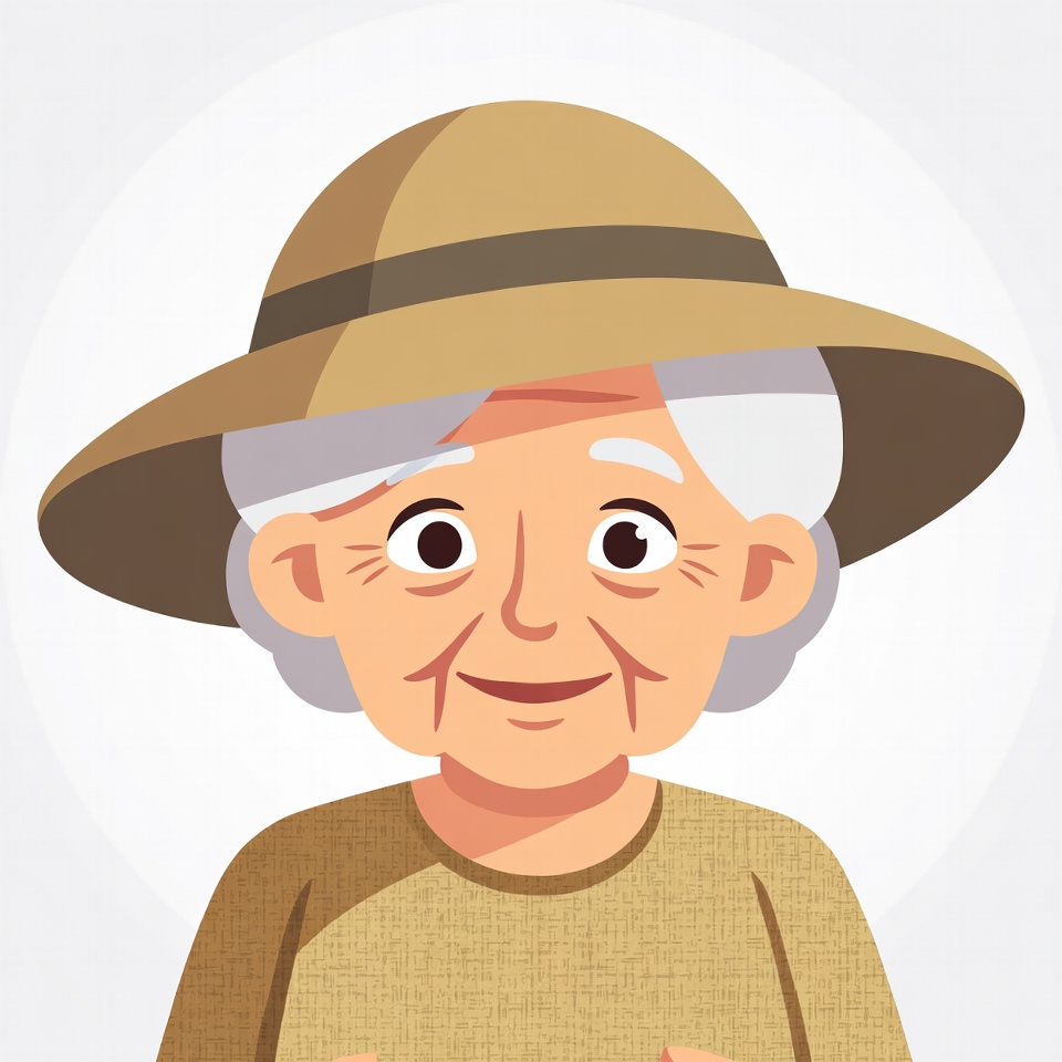 A cartoon illustration of an elderly White woman with white hair smiling happily. She wears a wide-brimmed tan sun hat and a beige sweater. The image is isolated on a white background.