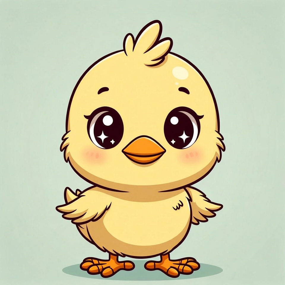 adorable chick, animal illustration, baby chick, big eyes, cartoon chick, chibi chick, chick illustration, clipart, fluffy chick, isolated background, kawaii chick, orange beak, orange feet, tufted feathers, yellow chick, cute chick