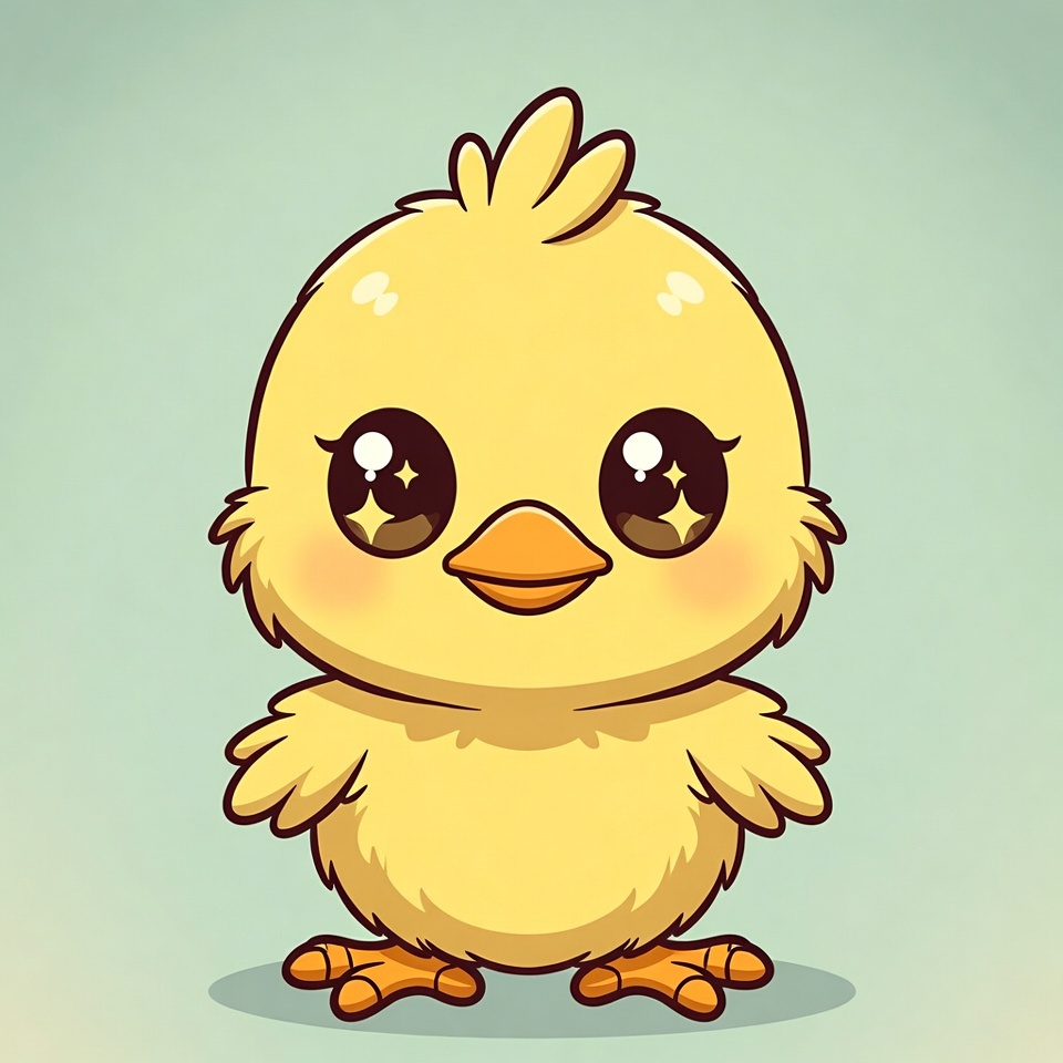 A kawaii-style cartoon yellow chick stands on a light green background. It has large sparkling eyes, fluffy feathers, and orange beak and feet. The chick faces forward with a sweet expression.