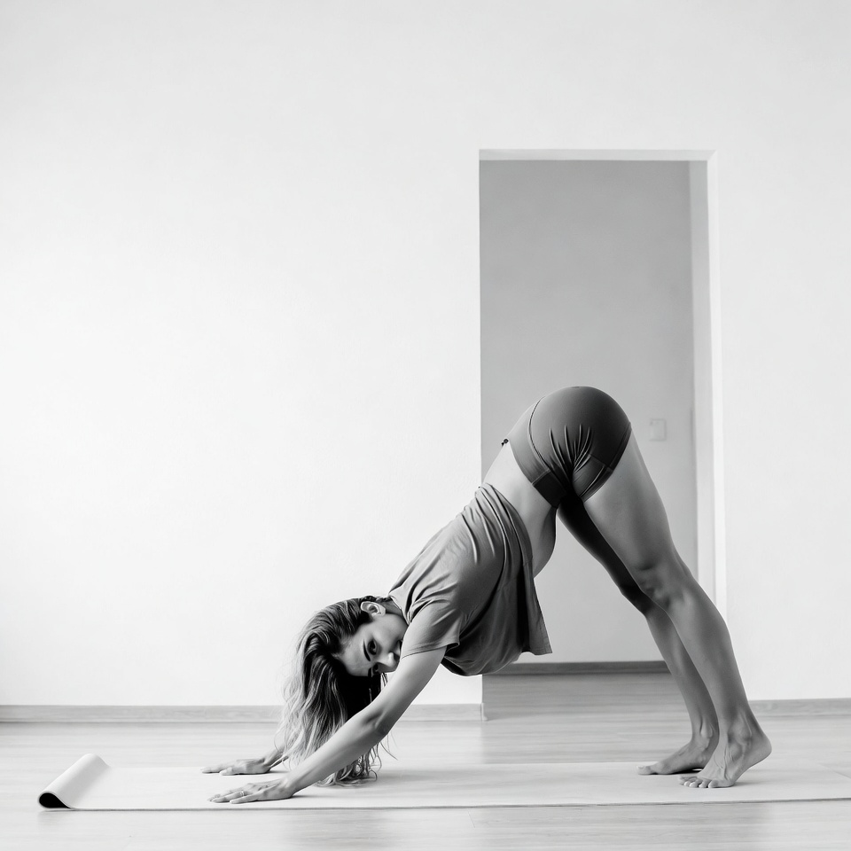 White, arched back, asana, athletic, black and white, blonde hair, downward dog, downward facing dog, exercise, female, fitness, flexible, gray shorts, gray t-shirt, indoor, long hair, minimalist room, monochrome, stretching, strong legs, wooden floor, workout, yoga, yoga mat, yoga pose, woman