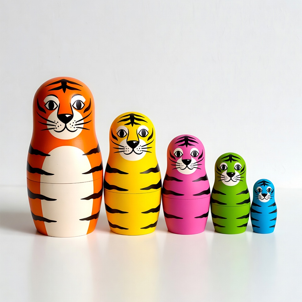 A set of five colorful tiger-themed matryoshka dolls stands in a row on a white background. The largest doll is orange with black stripes, followed by yellow, pink, green, and blue versions, each featuring cute tiger faces and white underbellies. They are wooden nesting dolls arranged from largest to smallest.