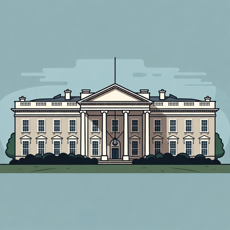 A flat vector illustration of the White House features a symmetrical neoclassical building with white columns, multiple windows, and a central portico. Green lawns and trees frame the front facade against a light blue sky. The design uses clean lines and a minimalist style.