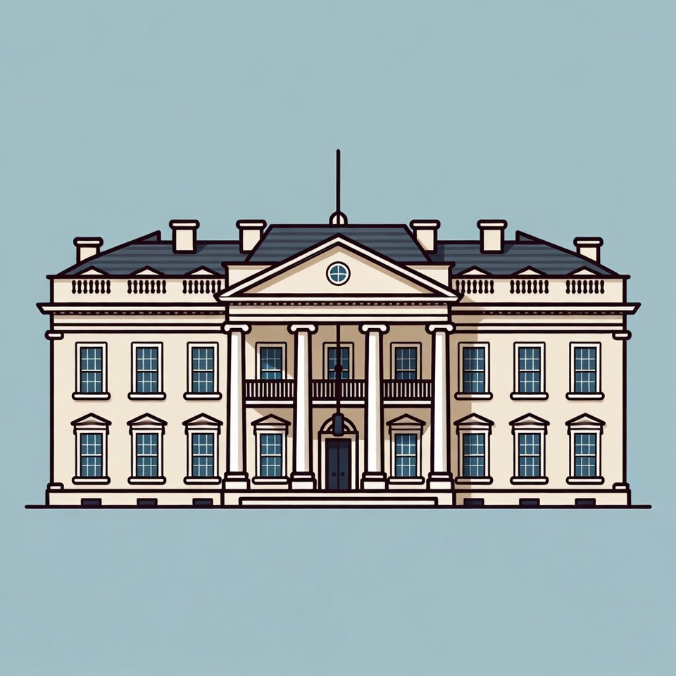 A detailed line art illustration of the White House features a white neoclassical building with columns, multiple windows, and a central entrance. The structure has a dark roof, dormer windows, and a flagpole on top. It is depicted on a light blue isolated background.