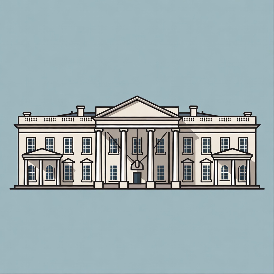 A simple line drawing illustration of the White House features a symmetrical neoclassical facade with tall columns at the central portico. Flanking wings include multiple windows and chimneys on the roof. The building is depicted on an isolated light blue background.