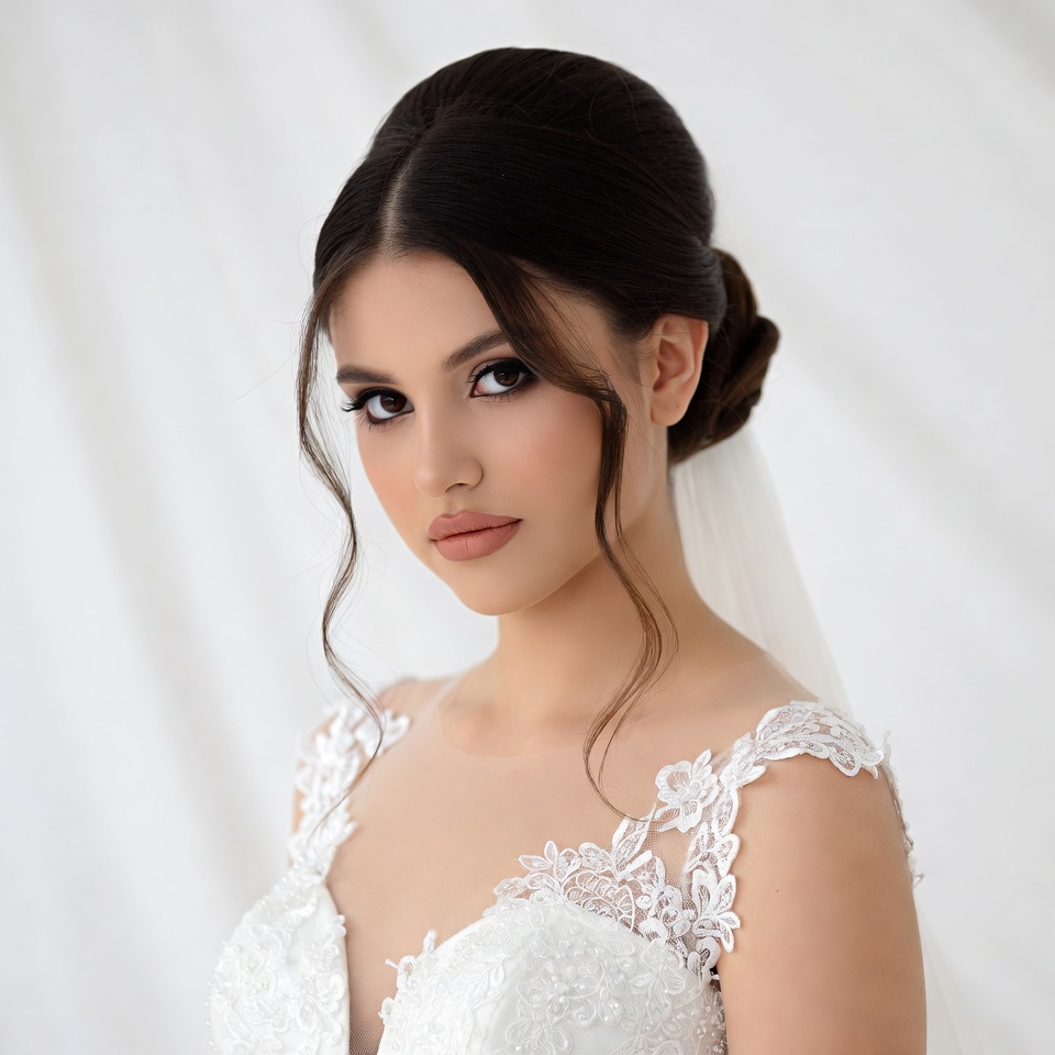 A young woman with dark hair styled in an elegant updo wears a white lace wedding dress with intricate detailing on the shoulders. She has a sheer veil draped over her hair and gazes slightly to the side with subtle makeup. The bride stands against a plain white background.