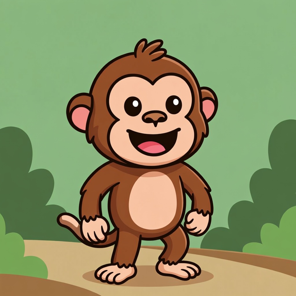 A cute cartoon monkey with big eyes and a wide smile stands on a path surrounded by green foliage. The monkey has brown fur, pink ears, and a tufted head, posed playfully with arms at its sides and tail visible. The illustration features a vibrant, isolated background with simple greenery.