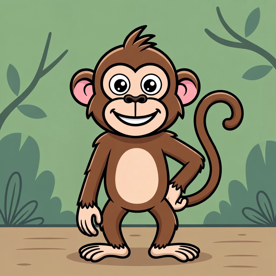 A cute cartoon monkey with big eyes and a wide smile stands confidently with one hand on its hip. It has brown fur, a curly tail, and pink ears against a green jungle background with leaves and branches. The illustration features bold outlines and a simple, isolated backdrop.