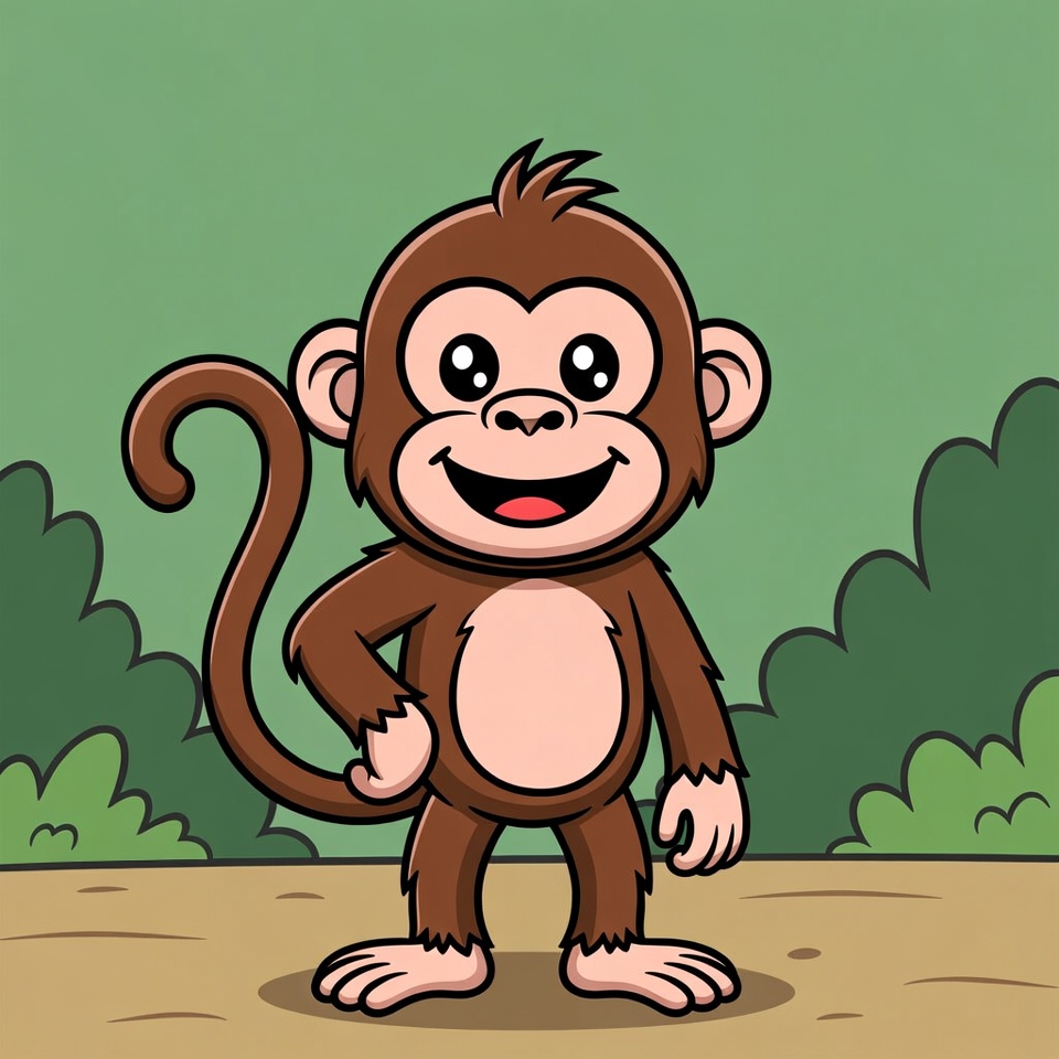 A cute brown cartoon monkey stands on the ground with one hand on its hip and tail curled behind. It has big sparkling eyes, a wide smiling mouth, and fluffy fur. The monkey is set against a simple green leafy background.