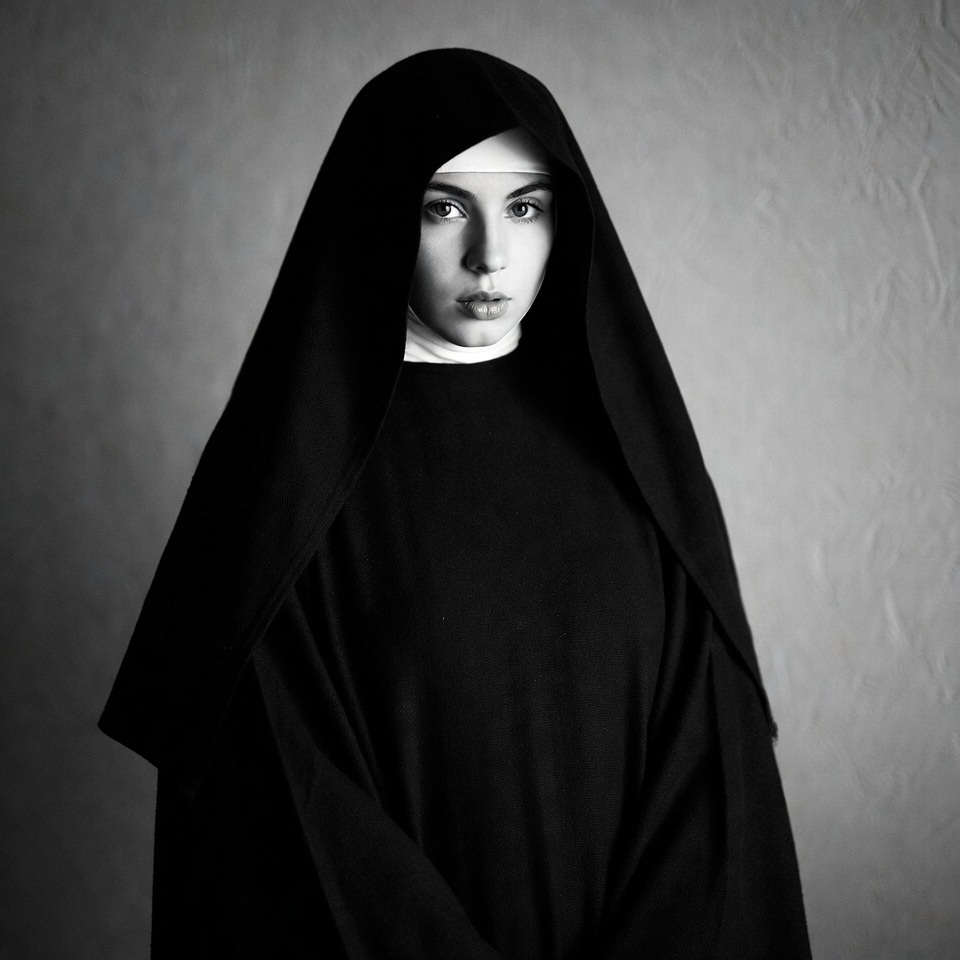 White, black and white, black habit, coif, female, isolated background, portrait, religious habit, veil, woman, young woman, nun