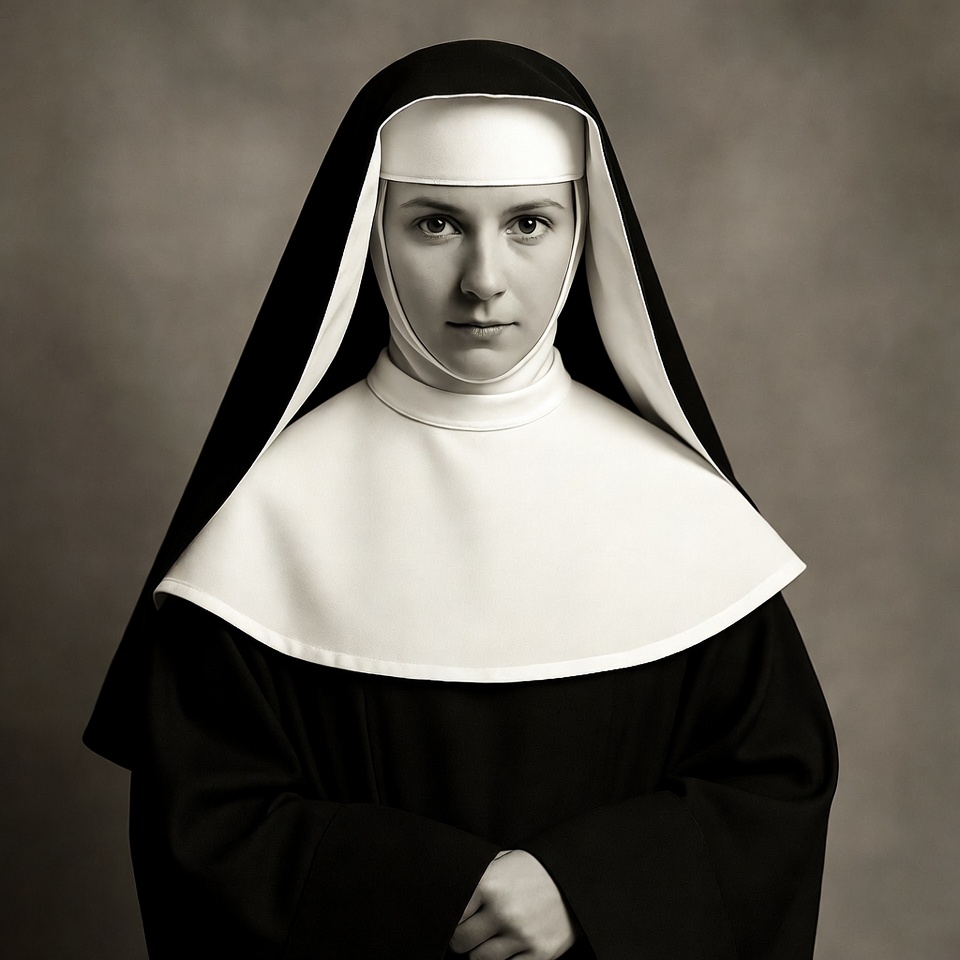 A young woman dressed as a nun stands with her arms crossed in front of her chest. She wears a traditional black and white habit with a white coif and black veil. The image is in sepia tone against a neutral gray background.