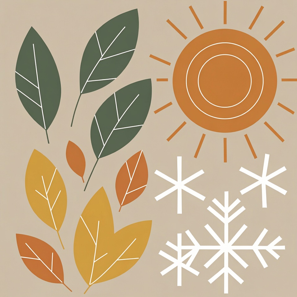 beige background, clipart, fall leaves, flat design, green leaves, illustration, isolated background, nature graphics, orange leaves, seasonal elements, snowflakes, sun, sunshine, winter snow, yellow leaves, autumn leaves