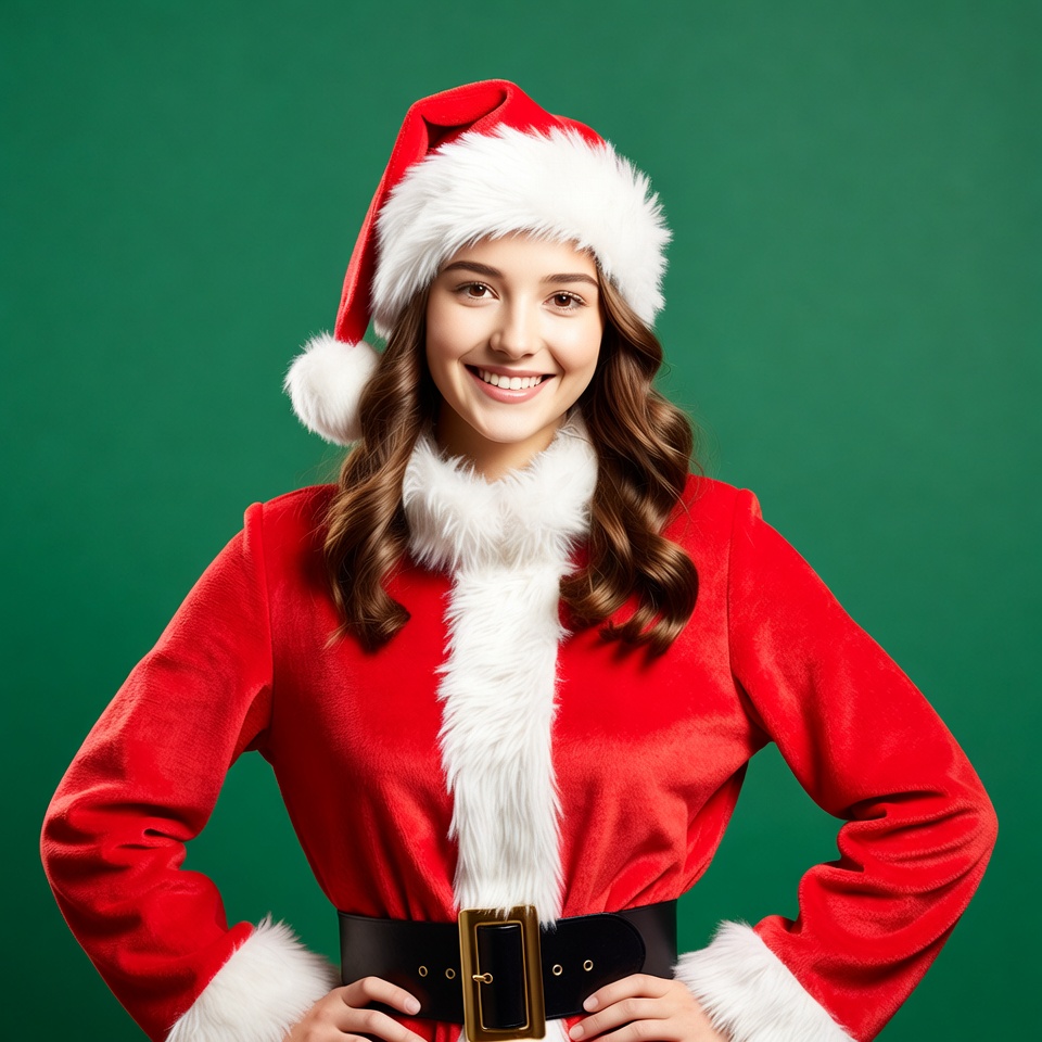 A young woman with curly brown hair smiles happily while wearing a red Santa Claus suit with white fur trim and a matching hat. She stands confidently with hands on hips against a solid green background. The outfit includes a wide black belt and fluffy white accents on the jacket and hat.