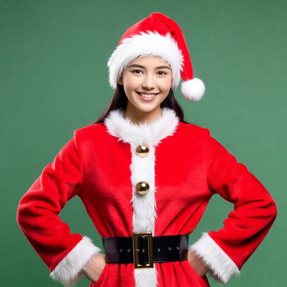 Asian woman, Christmas, Santa Claus, Santa hat, Santa suit, black belt, festive, fluffy hat, gold buttons, green background, hands on hips, holiday, long hair, pom-pom, portrait, red costume, smiling, standing, white fur, woman