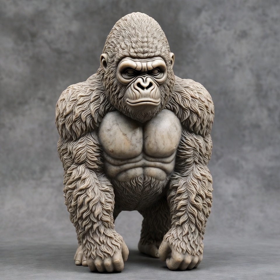 animal statue, ape figure, detailed carving, front view, fur texture, gray background, intense eyes, muscular gorilla, powerful pose, realistic sculpture, silverback gorilla, statue, stone sculpture, wildlife art, gorilla