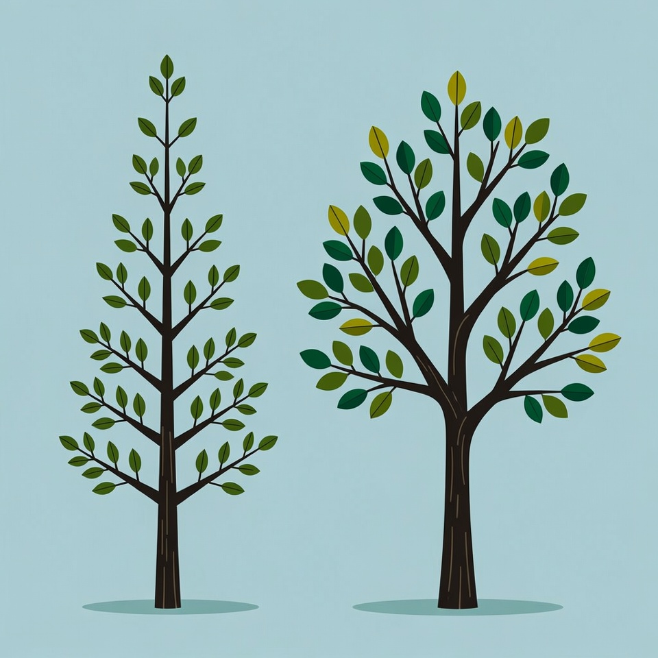 A simple vector illustration features two trees on a light blue background. The tall pine tree on the left has dense green needle-like branches and a straight brown trunk. The broader deciduous tree on the right displays green and yellow leaves with a sturdy brown trunk.