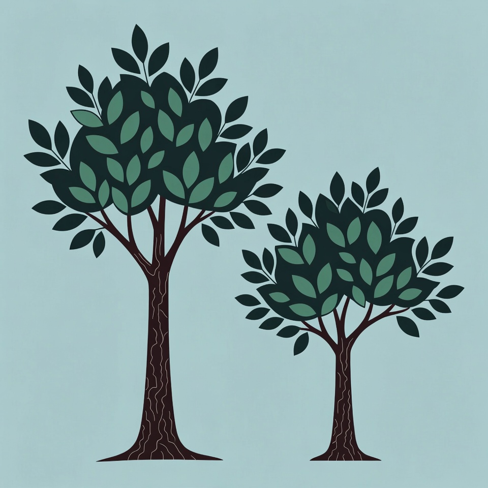 Two stylized green trees with brown trunks stand side by side on a light blue background. The taller tree has fuller foliage, while the shorter one is slimmer. The image features a simple vector illustration style with smooth outlines.
