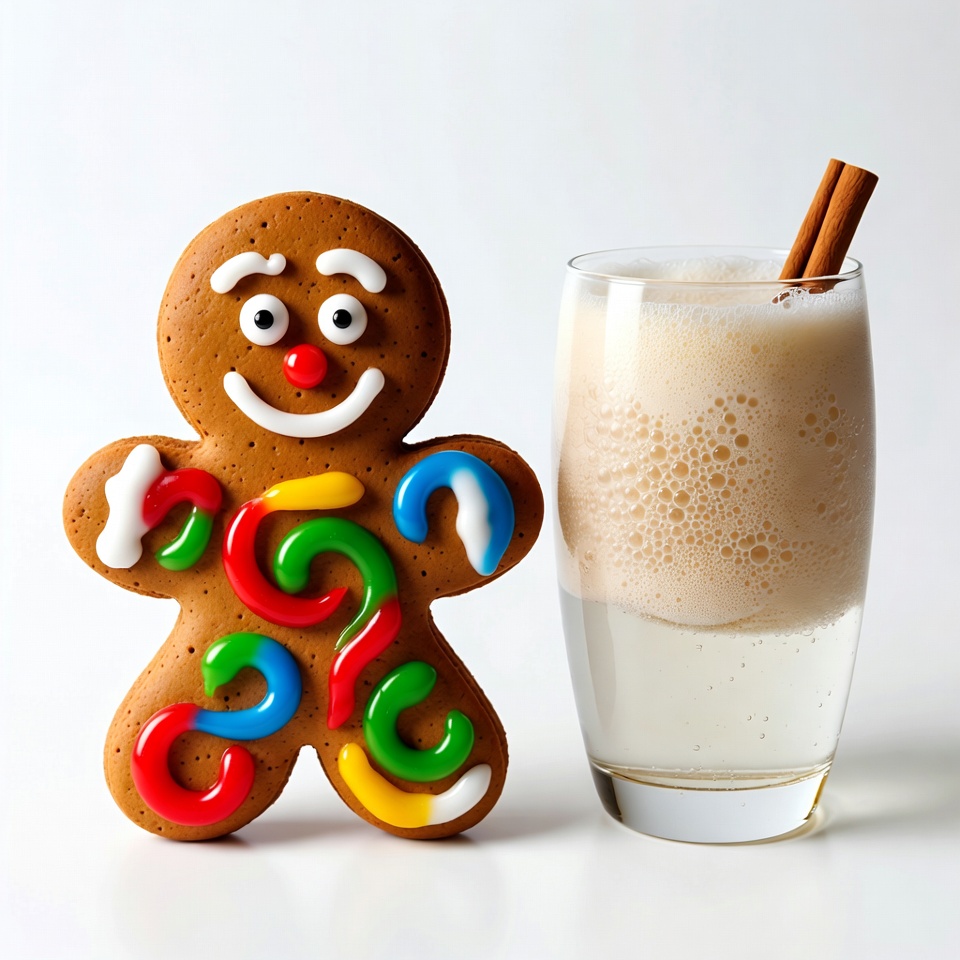A colorful gingerbread man cookie with white icing face, red smile, big eyes, and multicolored candy decorations stands on a white background. Next to it is a tall glass of frothy white milk topped with two cinnamon sticks. The image features a festive holiday treat arrangement.