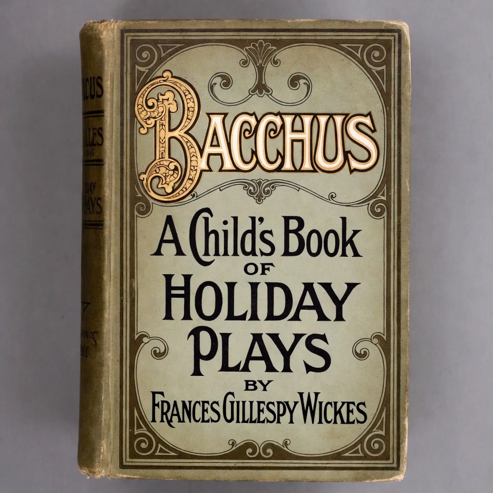 Bacchus, Frances Wickes, antique book, beige background, book cover, child's book, children's literature, decorative borders, floral design, gold text, holiday plays, holiday theme, literature, ornate lettering, spine text, vintage book