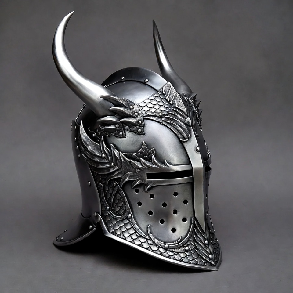 Renaissance helmet, battle helmet, black armor, cosplay helmet, dragon horns, dragon wings, fantasy helmet, horned helmet, isolated background, medieval helmet, metal helmet, ornate helmet, scale design, warrior helmet, Viking helmet