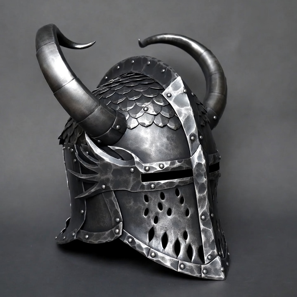 Norse helmet, armor prop, battle helmet, cosplay helmet, curved horns, dark background, dragon helmet, fantasy armor, forged metal, helmet closeup, historical helmet, horned helmet, isolated background, medieval helmet, metal helmet, scale armor, silver helmet, warrior helmet, wing design, Viking helmet