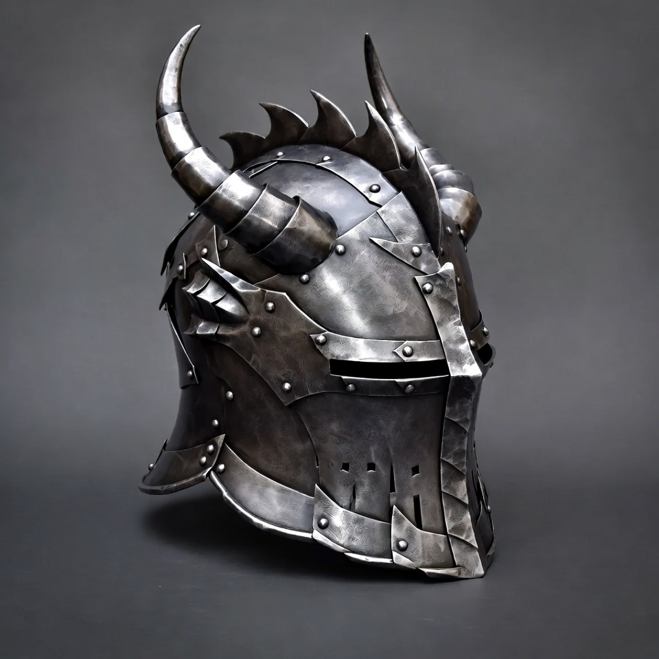 RPG helmet, armor prop, battle helmet, cosplay helmet, curved horns, dark background, demonic helmet, fantasy armor, horns, isolated background, medieval helmet, metal helmet, riveted metal, spiked helmet, spikes, warrior helmet, helmet